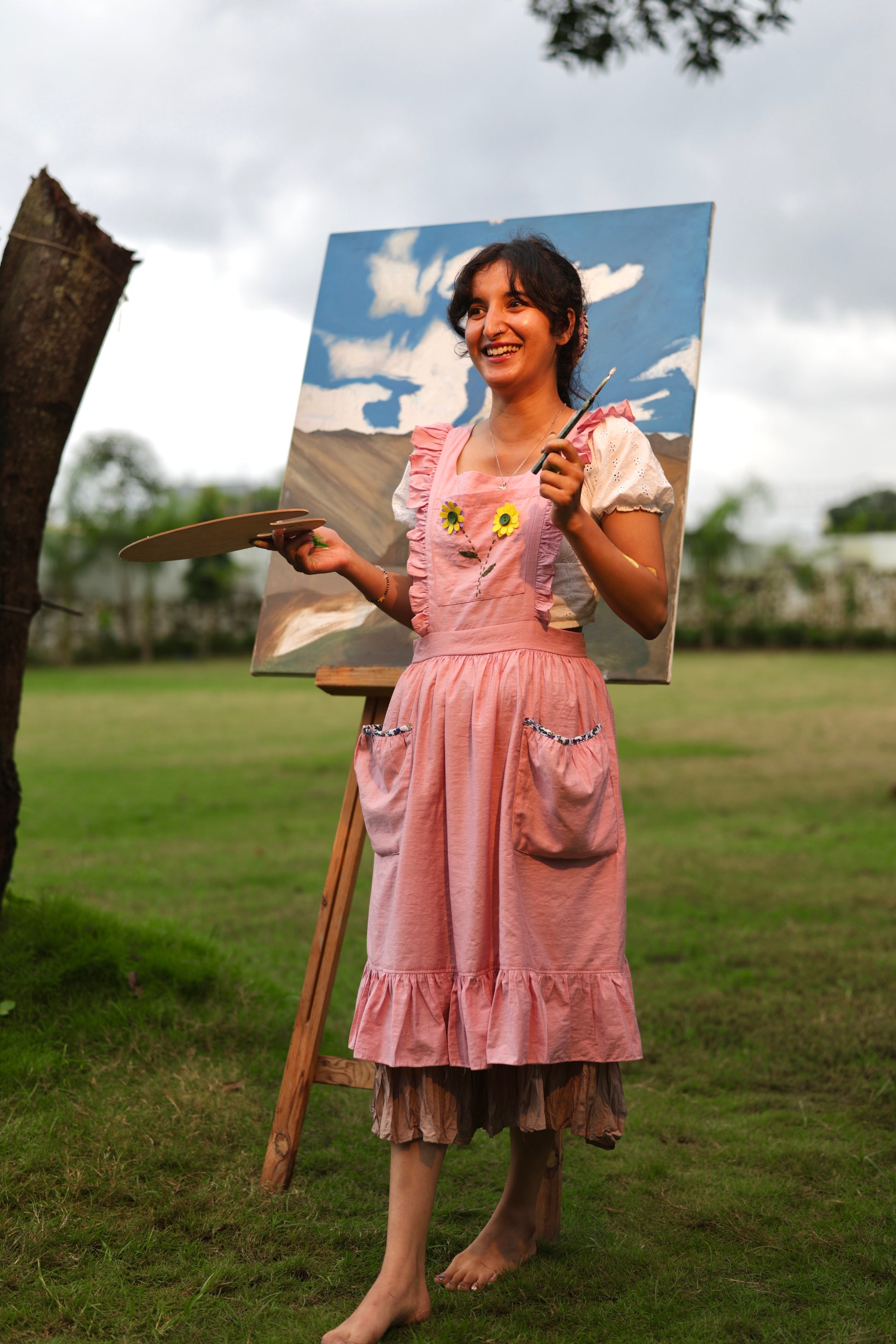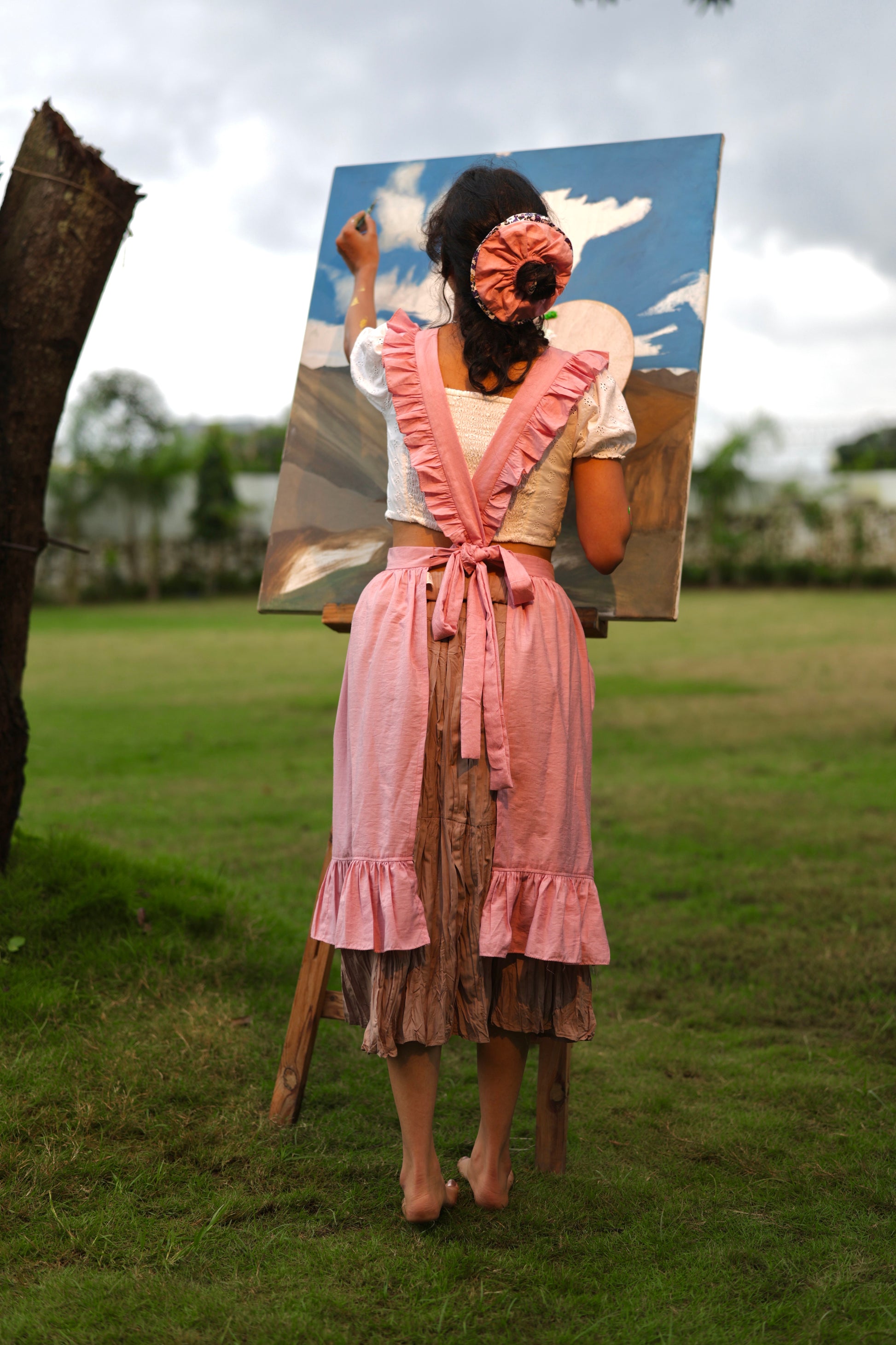 A joyful, vintage-inspired full apron that brings a splash of sunshine to your everyday routine. This blush pink apron features bold embroidered sunflowers, sweet, ruffled straps, and a gathered skirt that flatters every body. Perfect for baking days, slow living content, or adding a romantic touch to your studio wear.