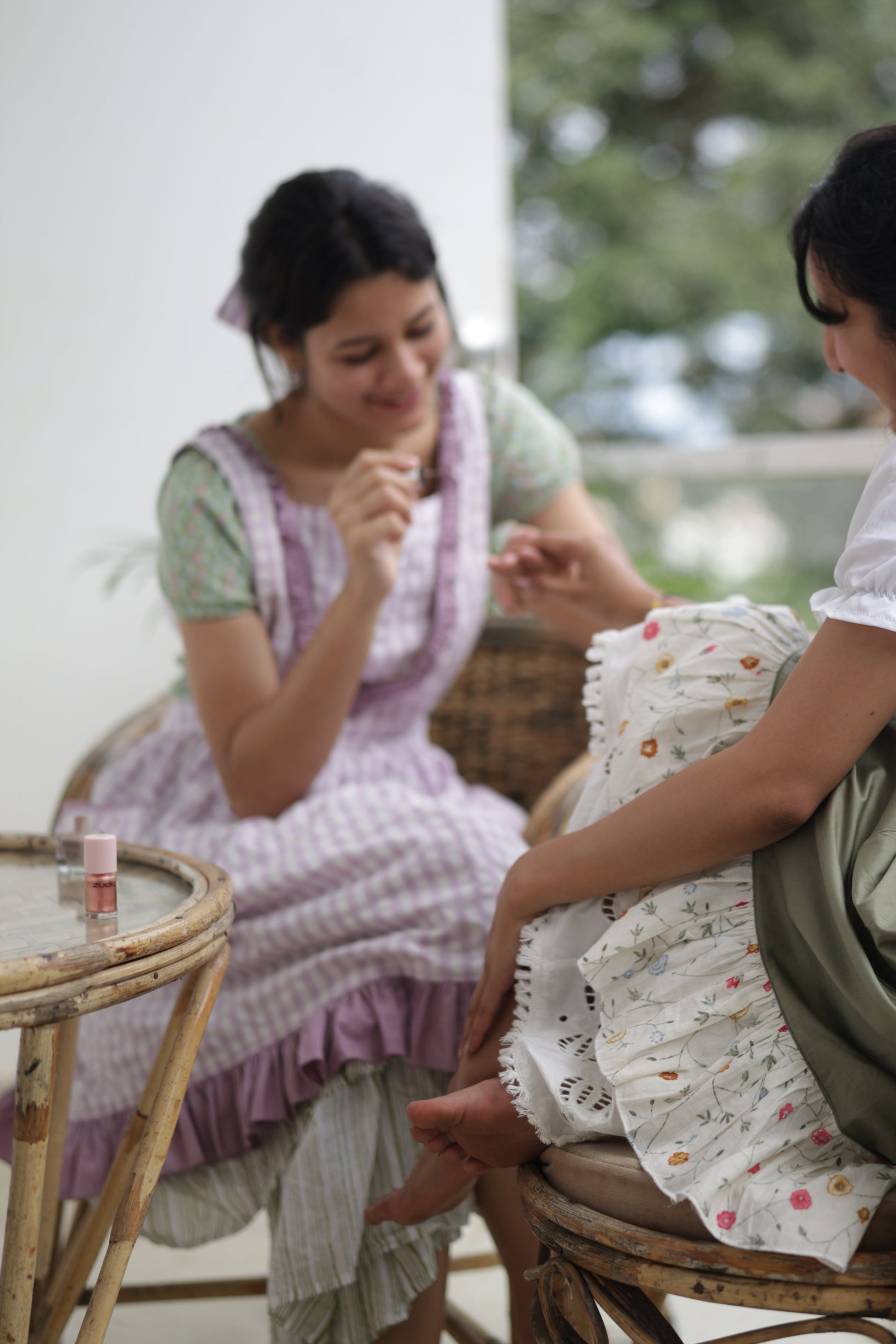 Soft lilac gingham checks with mauve contrast ruffle along the hem and bodice edge.