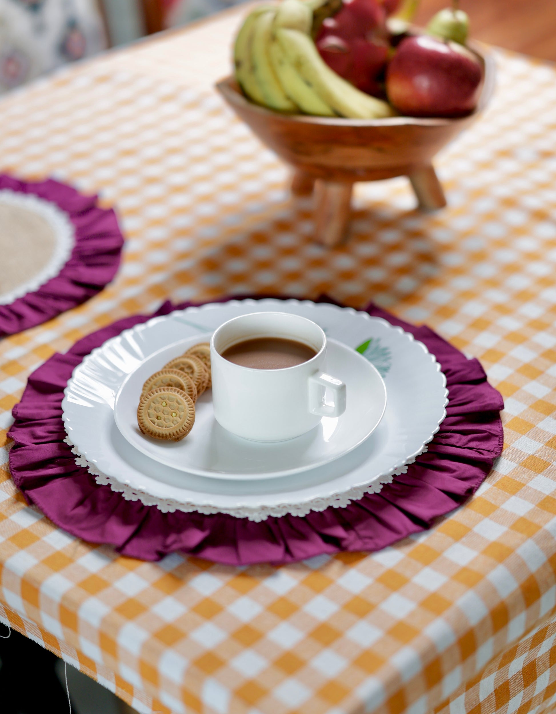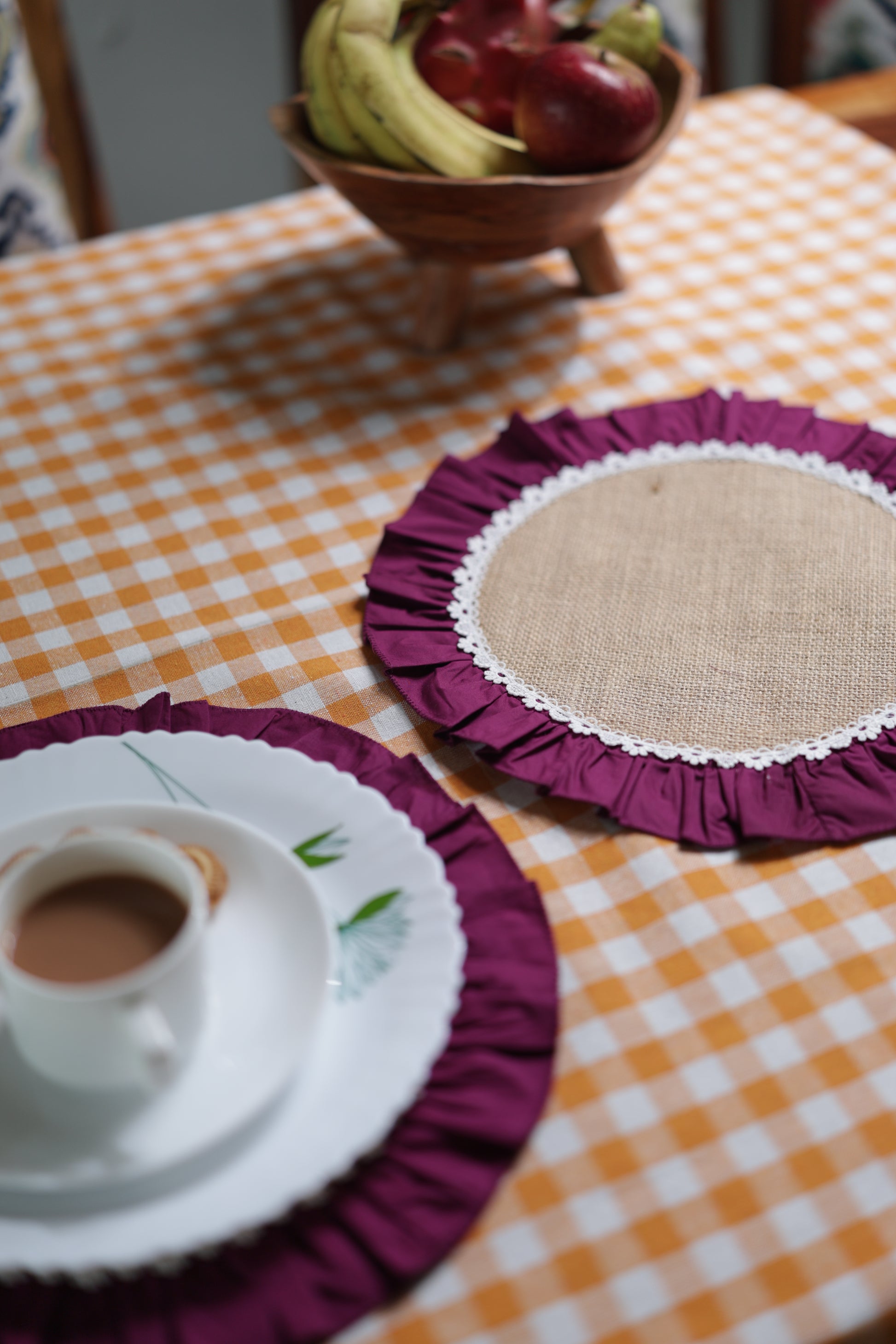 Elevate your table decor with this handcrafted ruffled table mat, made from natural jute and leftover cotton fabrics, promoting a zero-waste lifestyle. The earthy jute center offers a rustic charm, while the deep wine purple ruffled edge adds a pop of color and elegance. Finished with delicate lace detailing, this mat is perfect for placing planters, serveware, or centerpieces.
